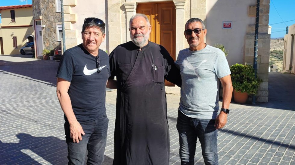 Οι Λατινοαμερικάνοι, παλαίμαχοι βιρτουόζοι της μπάλας, συναντήθηκαν μεταξύ άλλων με τον π. Γεώργιο Μπαλτζάκη, βγάζοντας αναμνηστική φωτογραφία έξω από τον Ιερό Ναό της Παναγίας.